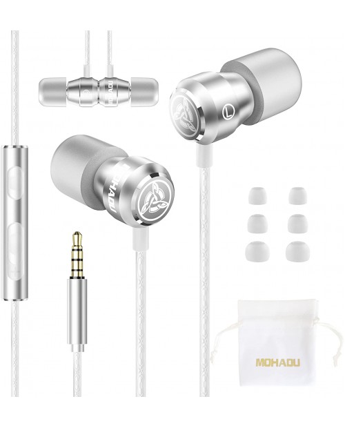 MOHADU Wired Earbuds with Microphone Memory Foam in-Ear Headphones 3.5mm Professional Metal Earbud Reinforced Cable Heavy Bass Sound Quality Music Earphone (White)